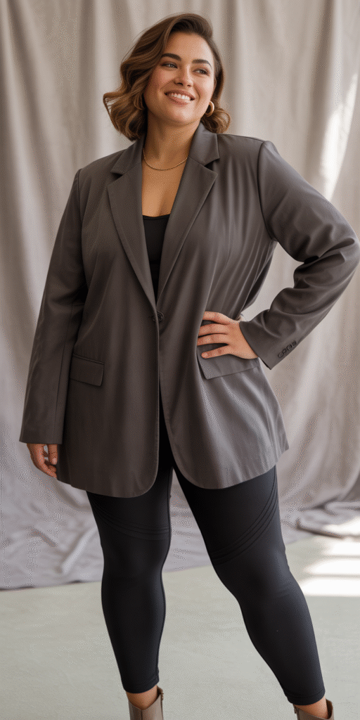 Style your blazer open over fitted turtlenecks or chunky knits to add dimensional texture to your look. Select thermal leggings with fleece lining or moisture-wicking properties for optimal comfort during temperature changes. Complete the ensemble with ankle boots or knee-high styles, adjusting your choice based on the blazer’s length for a polished winter appearance.