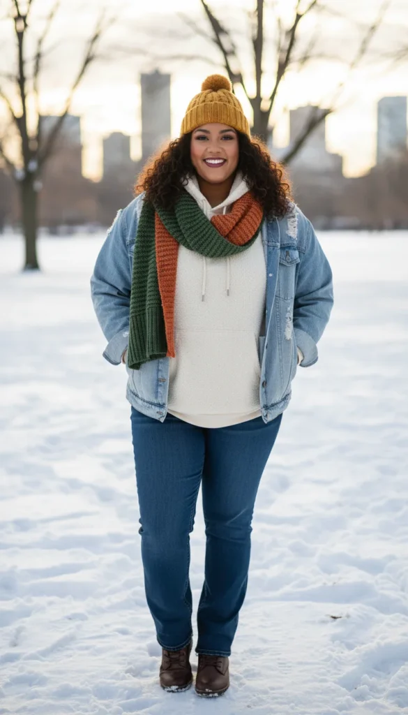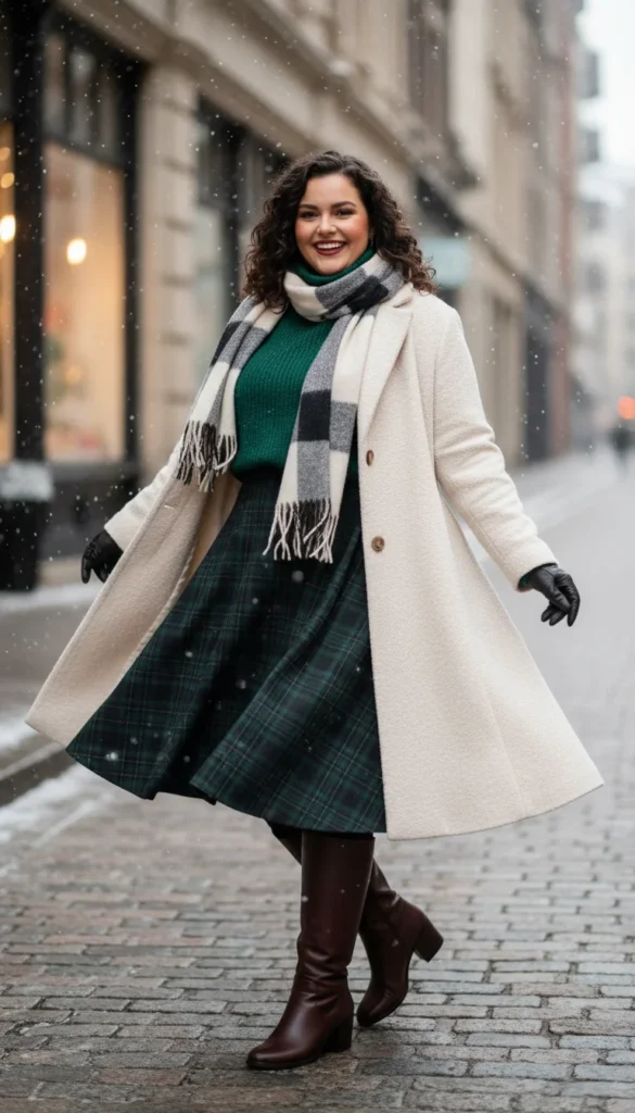 Layering a plaid shirt beneath a v-neck sweater creates one of winter’s most versatile and figure-flattering combinations for plus-size wardrobes. This strategic pairing draws the eye vertically while creating visual interest through texture contrast.