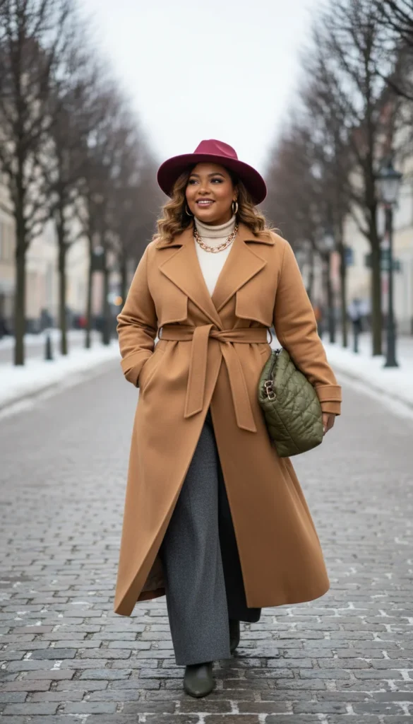 The belted trench coat with palazzo pants creates a sophisticated silhouette that flatters plus-size figures beautifully. The structured trench defines the waist while flowing palazzo pants provide comfortable movement and elegant drape. This combination offers versatile styling for transitional weather and professional settings.